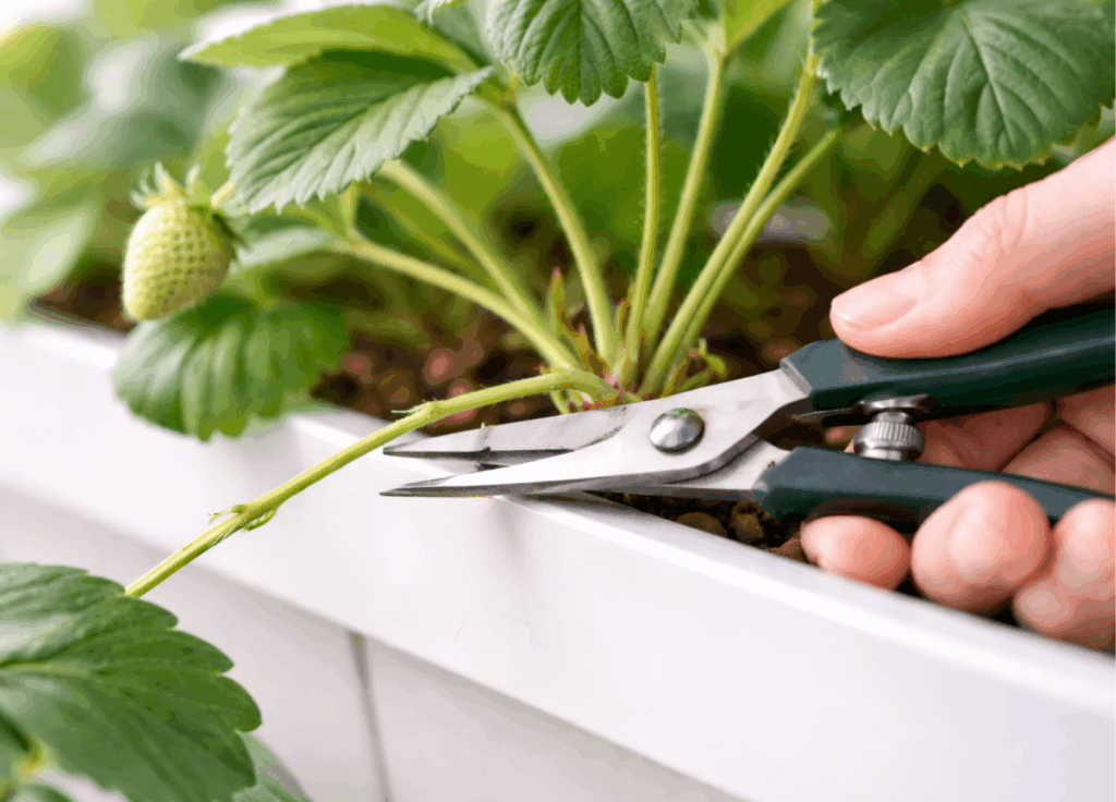 Guidance for garden strawberries recommends removing runners to keep the plant focused on crowns and fruit, and removing older leaves (and any diseased leaves) to reduce disease pressure.